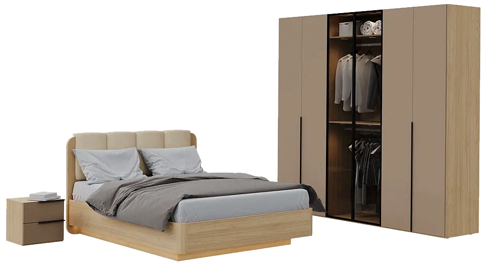 Актуальная коллекция в современном стиле. Выразительные фактуры, четкие формы, комфортные решения для сна, хранения и работы создают функциональное и стильное пространство для динамичной современной жизни.